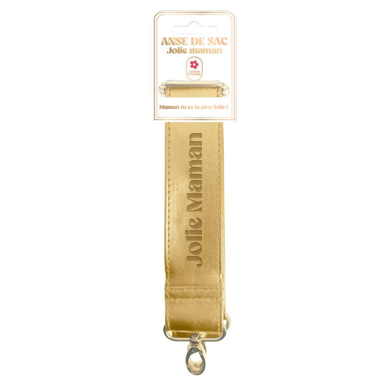 Parce que même les sacs méritent un relooking de star, offrez à votre maman l'accessoire ultime : l’anse de sac métallisée “Jolie Maman” ! Avec son effet doré qui brille plus qu’un coucher de soleil sur la plage et sa gravure stylée, cette anse transforme n’importe quel sac en it-bag de l’été. C’est le petit détail qui dit : “Oui, je suis maman, et oui, j’ai du swag.” Idéale pour personnaliser son sac avec une touche farniente chic, elle fait aussi un super cadeau qui dit “je t’aime” sans passer par une chanson ringarde. 82 cm de pur style (oui, comme une mini fête foraine pour son sac). À glisser direct dans le rayon fête des mères… ou là où l’amour brille autant que cette anse.