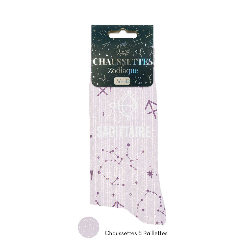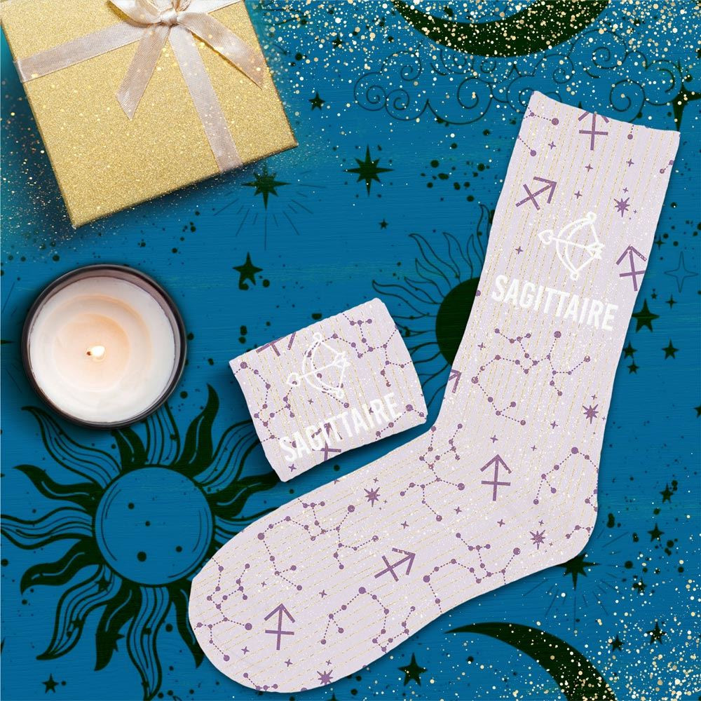 Préparez vos pieds à l’aventure cosmique avec ces chaussettes à paillettes violettes dédiées aux Sagittaires