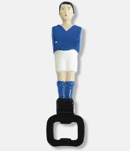 Voici le héros des apéros, le Zizou du zinc, le Platini du pop ! Ce décapsuleur en métal, fièrement moulé à l’effigie d’un joueur de baby-foot français classique, est bien plus qu’un simple outil : c’est un hommage vibrant à toutes vos soirées endiablées passées à enchaîner les buts en plastique et les canettes bien fraîches. Avec sa petite tête d’athlète vissée à l’ancienne et ses jambes soudées pour toujours en position de tir (la technique du "tir de la mort" comme au lycée), il n’a qu’une mission : faire sauter vos capsules avec style et nostalgie.