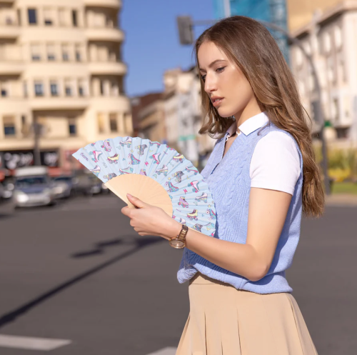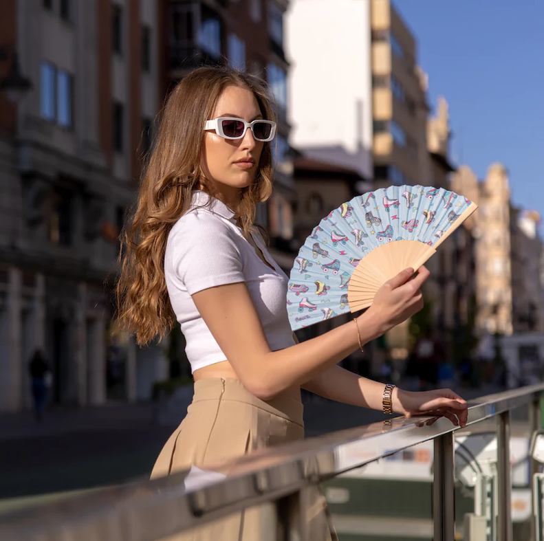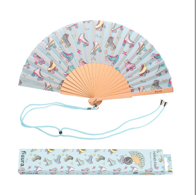 Préparez-vous à affronter la canicule avec style et nostalgie grâce à cet éventail au motif de patins bleus qui semble tout droit sorti d’un clip des années 80 ! Entre son look rétro fluo et sa vibe disco, il donnera à vos tenues estivales une touche funky qui fera tourner les têtes plus vite qu’une boule à facettes sous un soleil de plomb. En plus, il est pratique : grâce à son petit cintre malin, il reste toujours à portée de main — fini les fouilles archéologiques dans le sac pour retrouver de quoi ne pas mourir fondu.e en terrasse. Et parce qu’on veut bien transpirer, mais pas faire fondre la planète, cet éventail est fabriqué en bois issu de forêts gérées durablement, avec un textile tout doux pour Mère Nature. Offrez-le à vos amis, à votre famille ou à toute personne qui aime l'été mais pas le mode fournaise. Cet éventail deviendra votre arme secrète contre la chaleur et votre ticket pour un été vintage, ventilé, et 100 % stylé. Bref : cool comme un Mister Freeze, mais en plus classe.