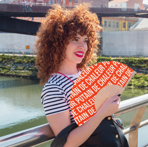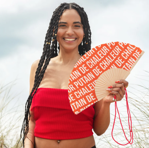 Heureusement, on a ce qu’il vous faut : un éventail coloré, pétillant, badass, avec un message clair comme de l’eau (fraîche) de roche : PUTAIN DE CHALEUR ! Rouge flashy, il va électriser vos tenues d’été tout en hurlant votre ras-le-bol avec style – parce que se plaindre, oui, mais en étant mignon·ne.