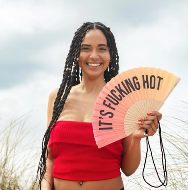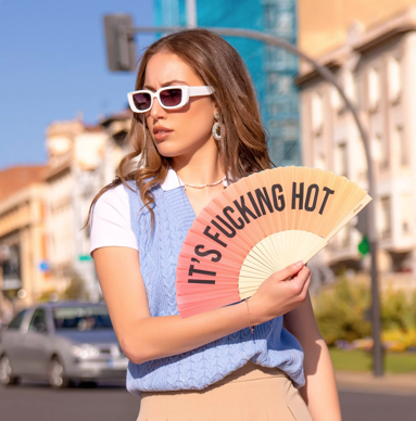 Comment ne pas en avoir ras-le-bun de cette putain de chaleur ? Tu transpires en dormant, ton cornet de glace se liquéfie avant même d’avoir dit "miam", les moustiques organisent un festin sur ta peau, et la clim fait un bruit de Boeing. Et ça, c’est juste le lundi. Alors oui, on en a marre, et cet éventail crie ce que tout ton corps hurle en silence : "It’s fucking hot" – le message clair, concis, et international.